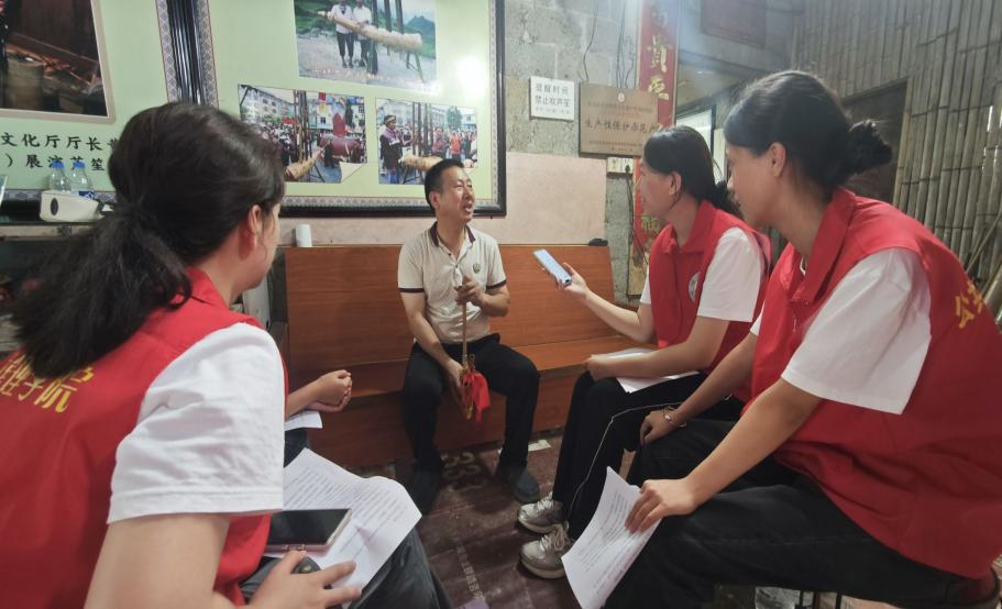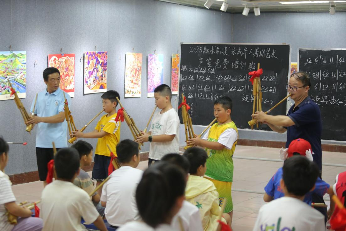与授课老艺术家潘文先交流,走访当地文化馆,参观芦笙吹奏艺术家为未成年人开设的免费培训班,在悠扬笙音中感受非遗魅力的场景,让学子们深刻体会文化传承的“接力”意义。