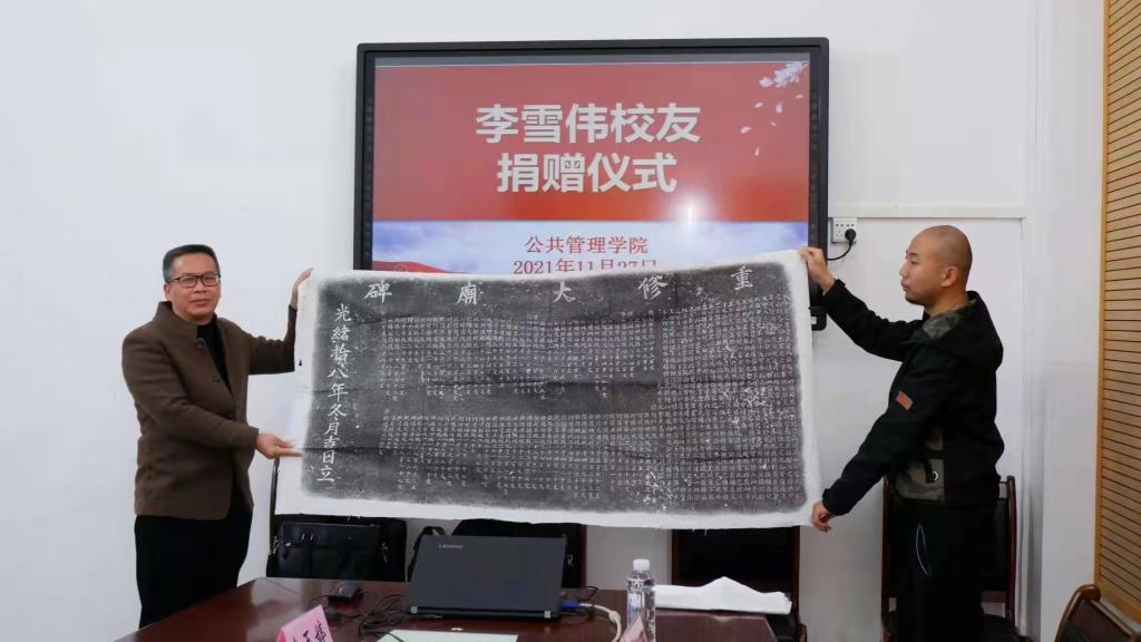 在公司办学70周年之际,11月27日,汉语言文学专业2011级员工李雪伟先生到william威廉中文官网捐赠《重修大庙碑》《口口口庙后座碑》两碑的拓片及部分古钱币。