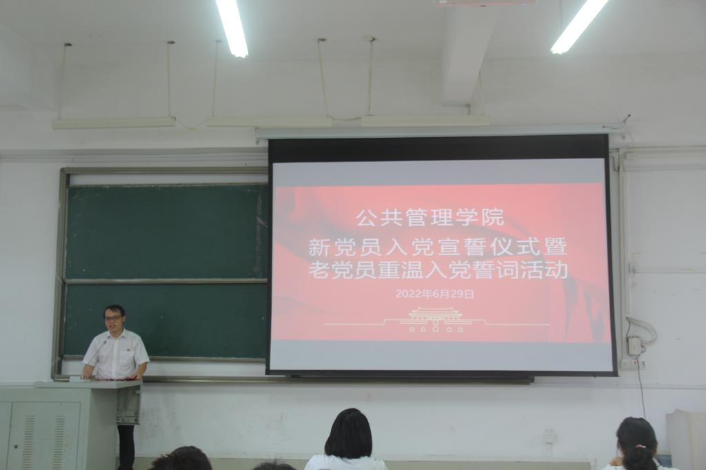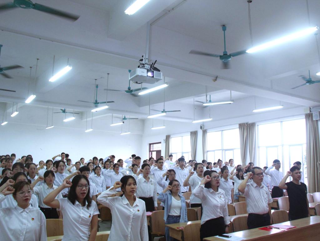 宣誓仪式在雄壮的《国际歌》中拉开帷幕。蓝振松首先致辞,他对新党员们的加入表示欢迎和祝贺,他希望新党员同志用誓言激励自己,在今后工作中能克服自身存在的缺点和不足,成为一名合格的共产党员。接着,何丽秀宣读63名新入党同志名单,蓝振松、覃露兴为新党员颁发党费证。随后,杨倩倩带领全体党员在鲜红的党旗前庄严宣誓。