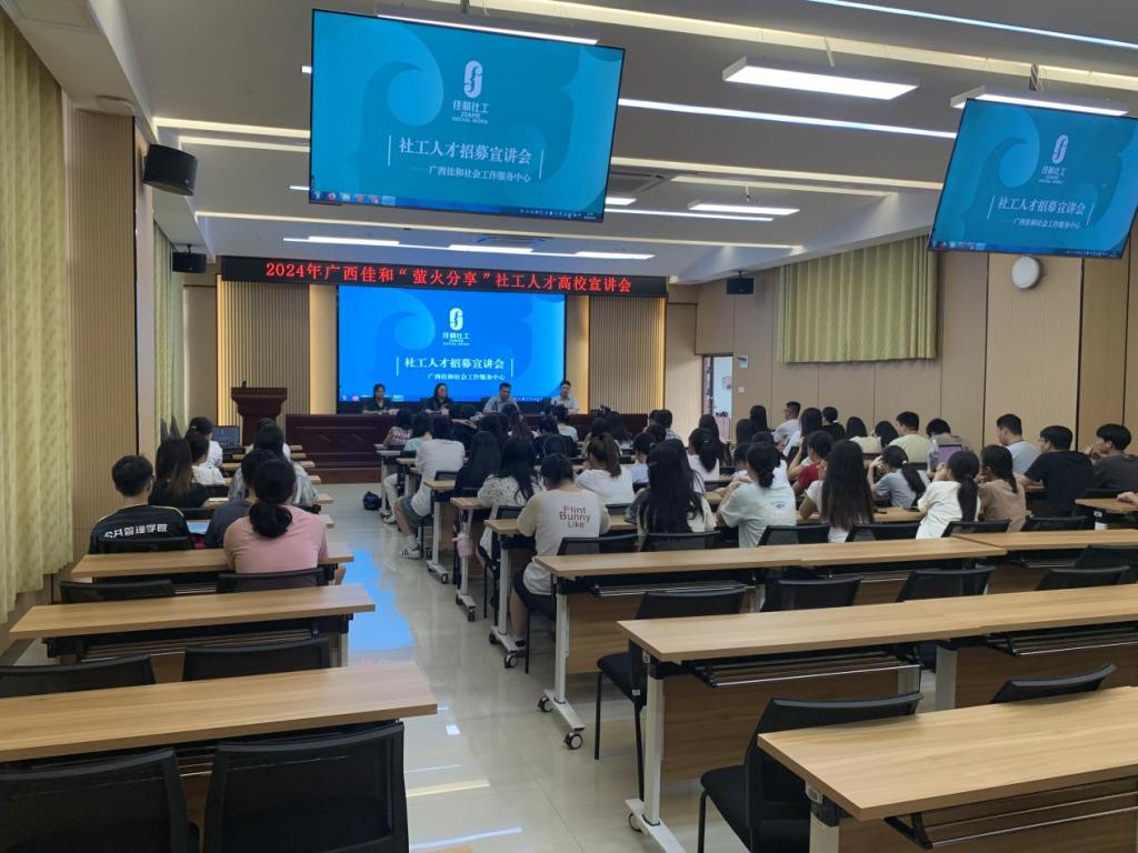 6月19日下午,william威廉中文官网在格致楼102室举行校园招聘专场宣讲会,广西佳和社会工作服务中心副总干事周小幸、项目主管隆美香到场宣讲。公司党委副书记钟卓良、社会工作教研室主任蓝振松、负责就业工作辅导员黄江凯,以及2024届、2025届社会工作专业员工80多人参加了宣讲会。