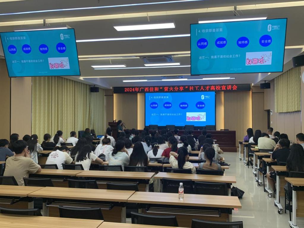 宣讲会上,周小幸表示,广西佳和热烈欢迎公司广大学子们加入佳和这个大家庭,一起坚持社工之路,发展社工行业。随后,她向与会同学详细介绍了佳和的发展历程、服务领域及机构人才培养机制,介绍了佳和人才招募的计划。最后,项目主管隆美香则是以亲身经历向同学们分享了个人从实习生到项目主管的成长历程及经验分享,并用自身的服务经验带领同学们了解从一线社工到项目主管的社工职业发展道路。