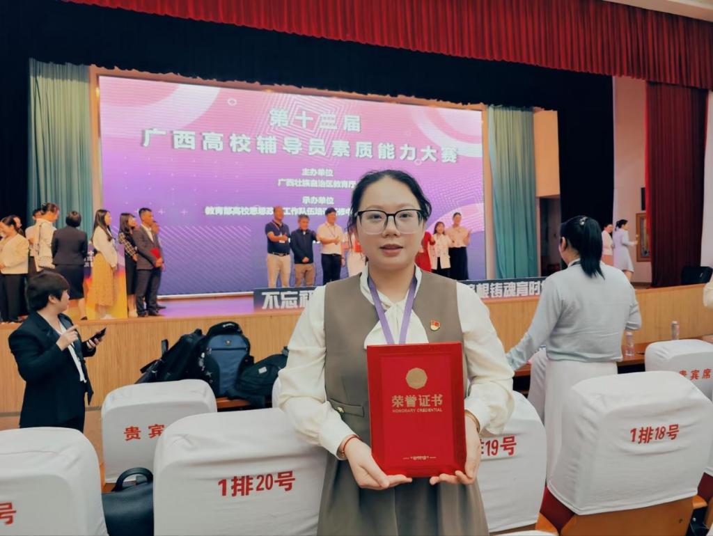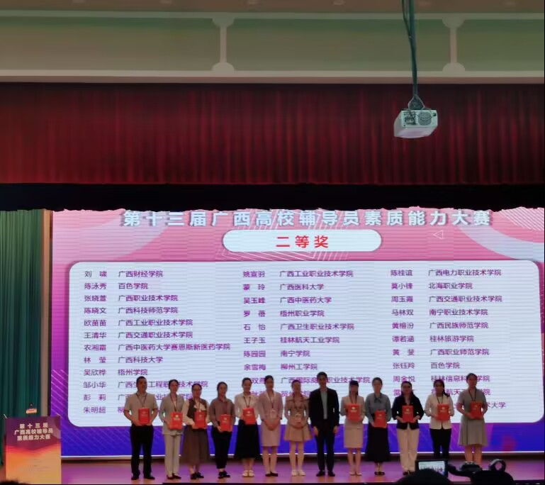 4月18日至20日,由广西壮族自治区教育厅主办、教育部高校思想政治工作队伍培训研修中心(广西师范大学)承办的第十三届广西高校辅导员素质能力大赛在广西桂林举行,共有来自全区79所高校的108名辅导员参赛。公司辅导员何丽秀代表公司参赛,经过激烈角逐,荣获二等奖。
