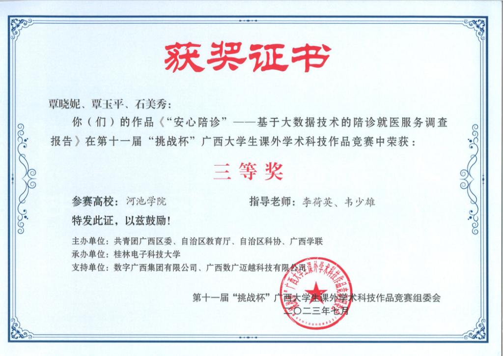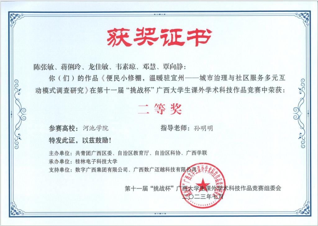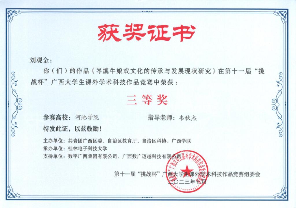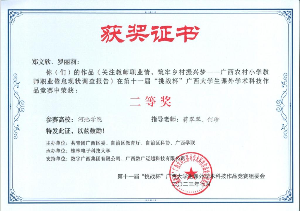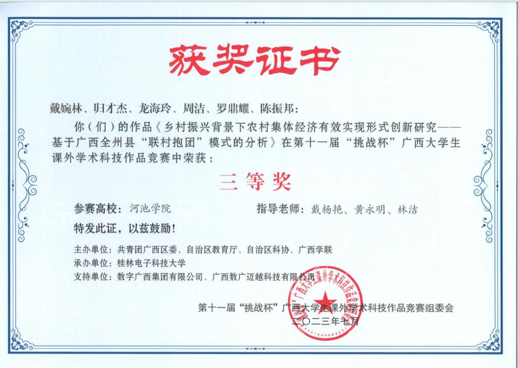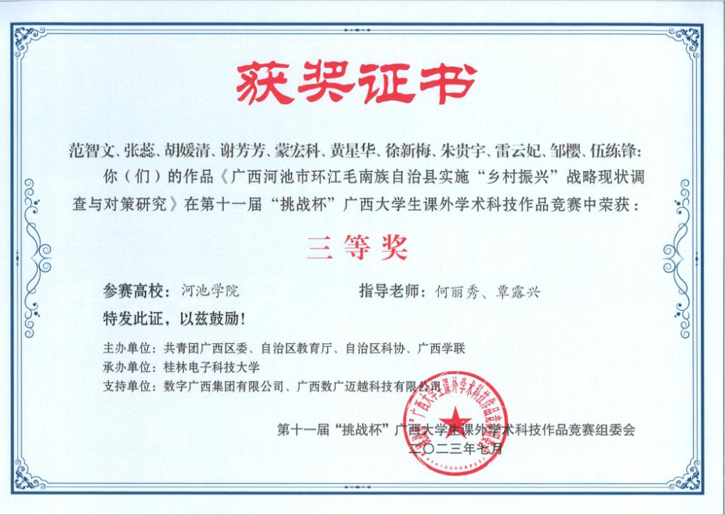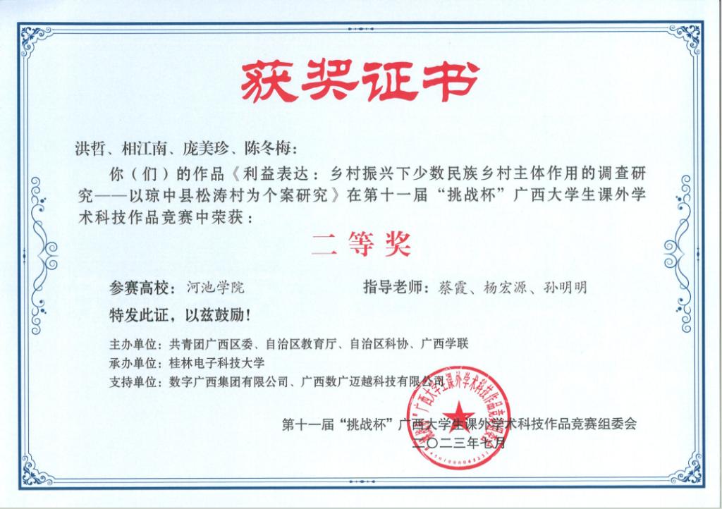 近日,广西壮族自治区教育厅等部门联合发布《关于公布第十一届“挑战杯”广西老员工课外学术科技作品竞赛获奖名单的通知》(桂青联发【2023】12号),公司荣获二等奖3项、三等奖5项。