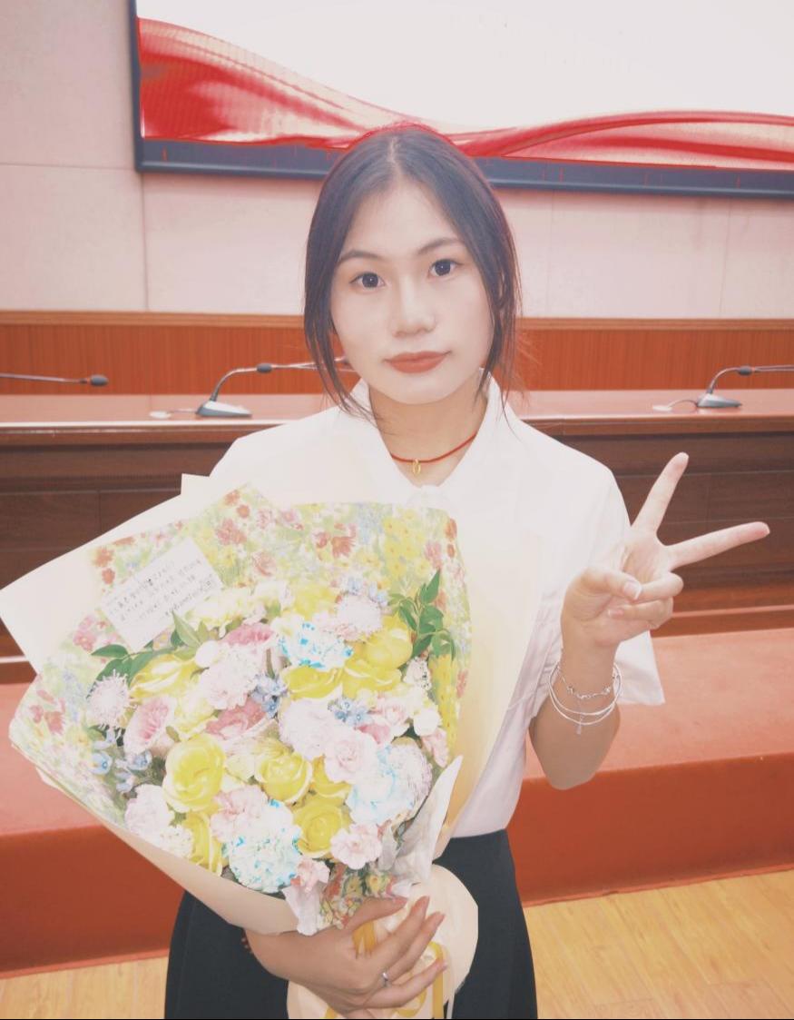 她勤奋进取,学业与综测成绩均名列前茅,成功完成省级老员工创新创业项目,荣获“挑战杯”广西老员工课外学术科技作品三等奖。在担任班长、心理部部长等职务期间,她履职尽责,获评“优秀员工干部”,以全面发展的优异表现为学子树立榜样。